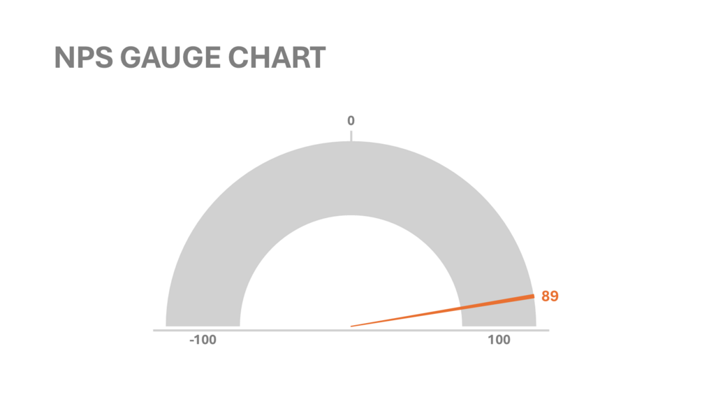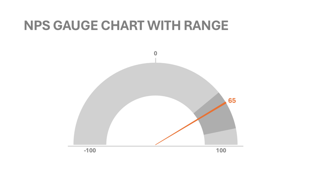 Net Promoter Score (NPS) ranges from -100 to +100. That makes a traditional Gauge chart in Excel/PowerPoint pretty tricky. I've got you covered though with a plug & play template. The download comes with both Excel and PowerPoint files with two Gauge versions. One with a single grey arc and one with a range. You'll be able to enter your value (-100 to +100) and watch the chart update. You'll just want to be sure to add text boxes or adjust the text boxes that are already there to the correct position since the labels aren't part of the live chart (super easy though!).