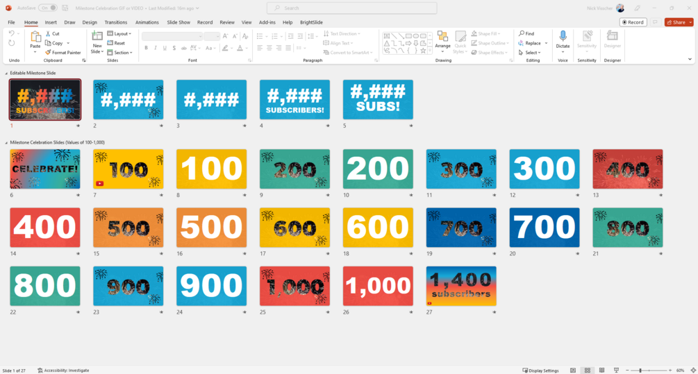 This PowerPoint file download (.PPTX) includes individual slide options for celebratory number values in increments of 100 (100-1,000) and includes the royalty free background 'fireworks' video. The file also includes an editable slide with instructions on how to edit colors, font, text value, how to use the 'merge shape' feature (that's how we get the see-through or cookie cutter effect in the colored background) and how to export your slide as an image or video file.Â