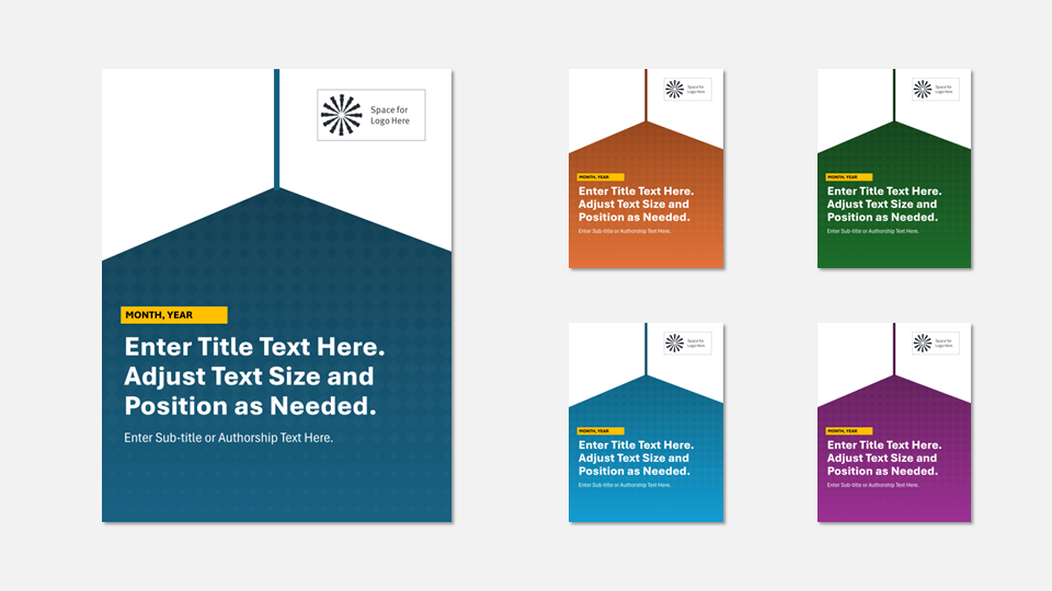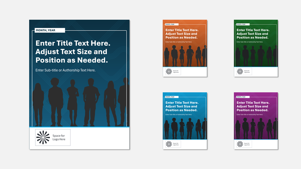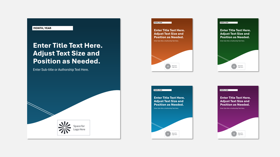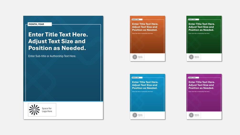 Report cover page design template comes with five design schemes; CLASSIC SQUARE, SILLOUHETTES, ANGULAR LINES, INVERTED ANGLES, and CURVED LINES. Each of the cover page designs is in a variation of the 6 accent colors in your PowerPoint theme - which means these templates will update to your brand colors after you've programmed your custom color theme. If you don't know how to do that, watch this quick tutorial for embedded custom colors into your own PPT file. If you'd rather use the Microsoft default color theme you can go with what we have here (blue, orange, green, light blue, and purple).
